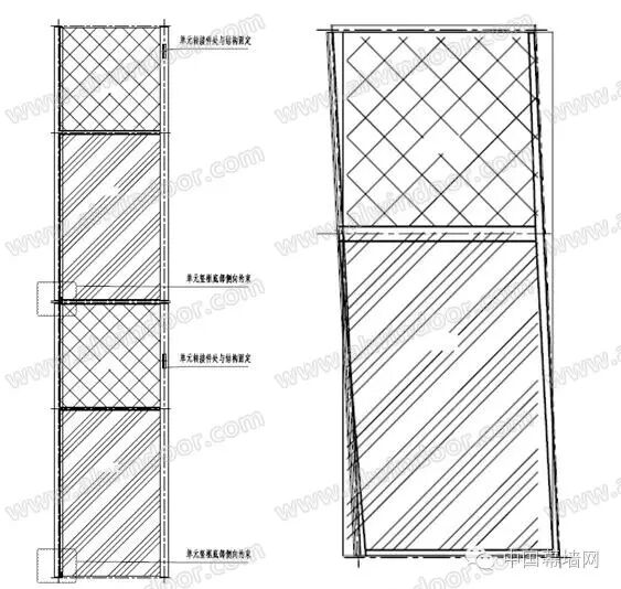 单元体幕墙在安装过程中,单元一侧挂件与转接件固定,另一侧的竖框底部用插芯或者连接件做侧向约束,这样,发生形变的时候单元体通过框材变成平行四边形来吸收变形。如上图所示。