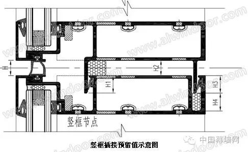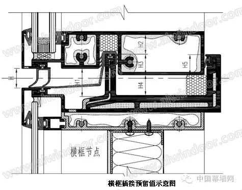 横框插接量限制尺寸设计 H1~H5尺寸均应大于或等于H。其中,H1、H2、H4为预留的单元变位空间,避免上下两单元因变位而相互挤压变形破坏;H3、H5为单元插接量,保证单元在产生变位时不会相互脱离,破坏插接。位而相互挤压变形破坏;H3、H5为单元插接量,保证单元在产生变位时不会相互脱离,破坏插接。
