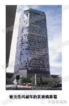 超高层建筑所处的风环境相对复杂,风压分布不均匀且风速过大。风速、风压会随着建筑高度的增加。如城市市区C类地面粗糙度,高度为400、450米的风压高度变化系数Mz=3.12,100米时为1.70,150米时为2.03,200米时为2.30,300米时为2.75等。这点对于以风荷载作为控制荷载的幕墙是极重要的。当建筑造型布局不当时,在建筑物外部往往造成局部不良的风环境:掀起屋顶覆盖物、破坏围护结构、幕墙玻璃、门窗等。超高层建筑采用玻璃幕墙作为围护结构,在风荷载作用下外皮破坏或掉落对周围街道及行人会造成重大伤害,容易出现安全隐患的部位主要集中在悬挑外装饰构件及外部遮阳结构。例如:遭到龙卷风袭击的美国田纳西某摩天大楼,玻璃幕墙严重破坏。