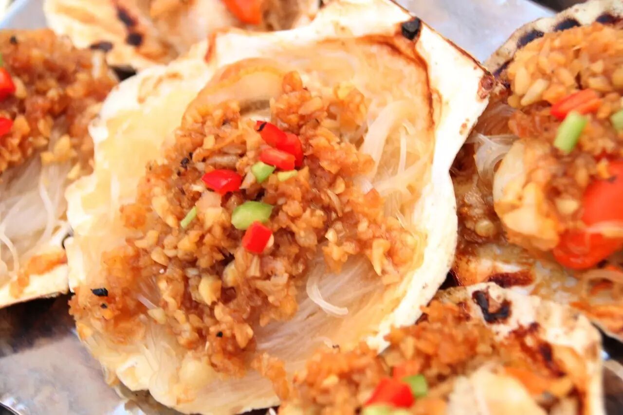 烤扇贝:还有一个必点菜就是扇贝!这道菜刚一上小编的口水就流了出来,扇贝肉很多,味道也很鲜,上面铺满了蒜蓉,蒜蓉也是一绝,去掉了蒜的辣味,吃完以后也不会留下口臭。