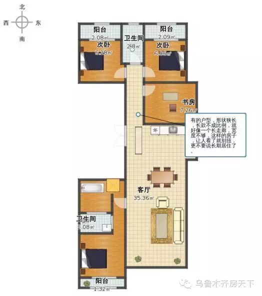 有的户型,形状狭长,长宽不成比例,就好像一个长走廊,宽度不够,这样的房子,让人看了就别扭,更不要说长期居住了。