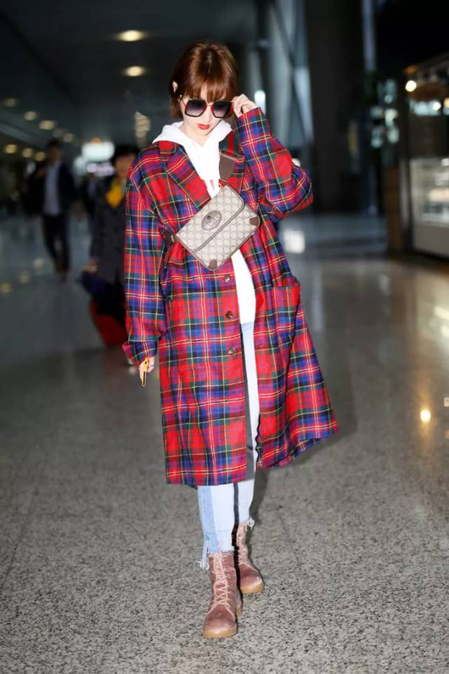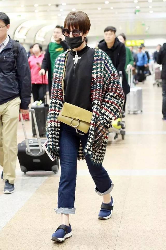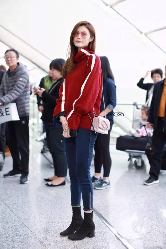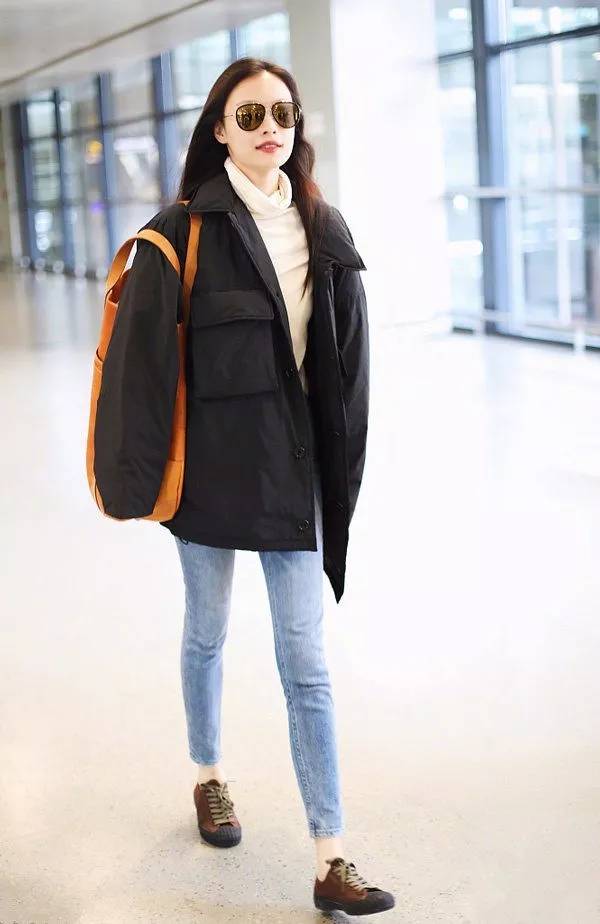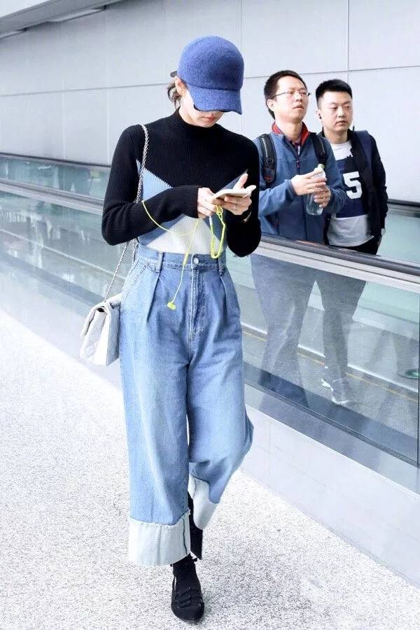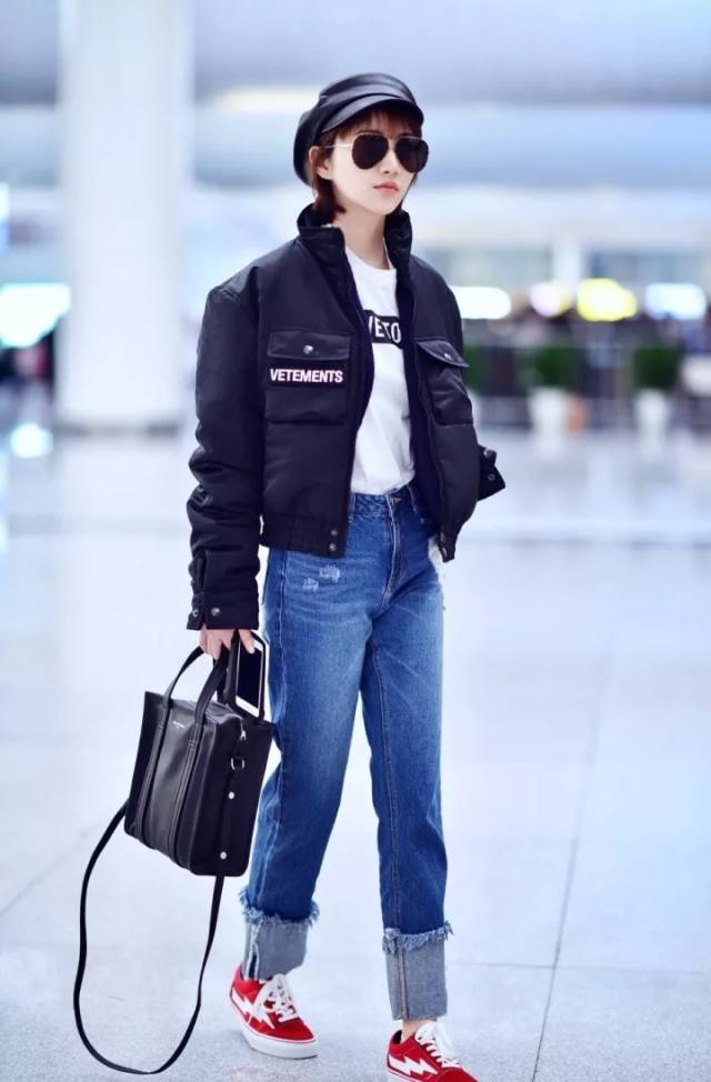 景甜近日现身机场,用卷边牛仔裤搭配棒球夹克和滑板鞋,帅气有型,酷酷哒!