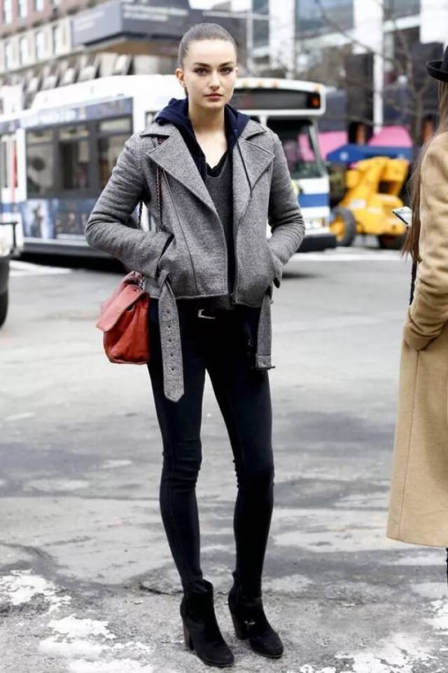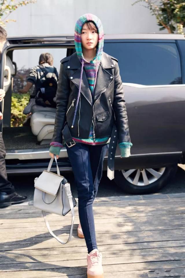 周冬雨,皮衣、卫衣、紧腿牛仔裤搭配小粉鞋,秋冬帅气的少女穿法,非常实用。