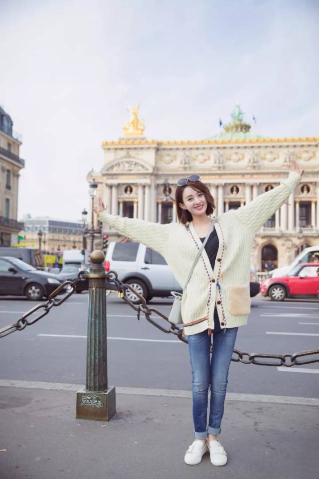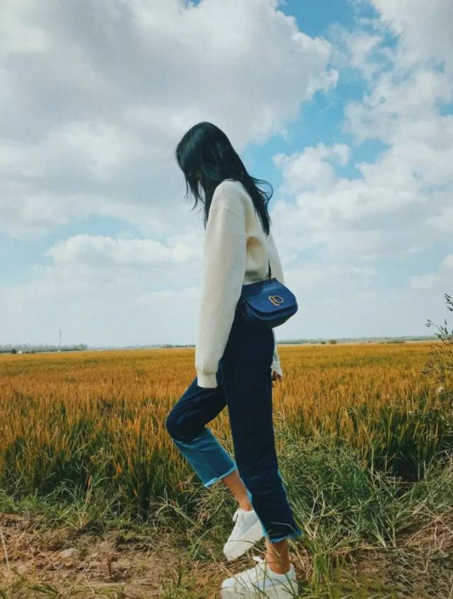 大表姐的白色毛衣搭配拼色牛仔裤看起来清新自然,在大自然中露出笑颜的表姐真是元气满满,每一帧都是大片既视感。