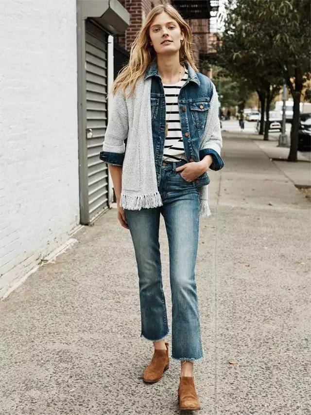 利用牛仔蓝的颜色深浅变化,让单一的牛仔单品也变的有趣起来,更具层次感。不论是在裤脚的细节处拼色还是裤腿的大面积拼色,都能让搭配更趣味。