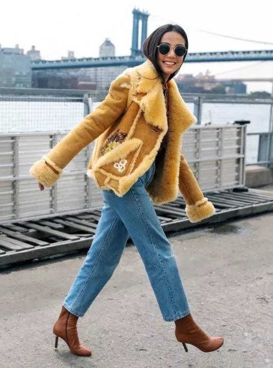 时尚博主Yoyo Cao用羊羔绒外套搭配直筒裤,时髦的复古范。