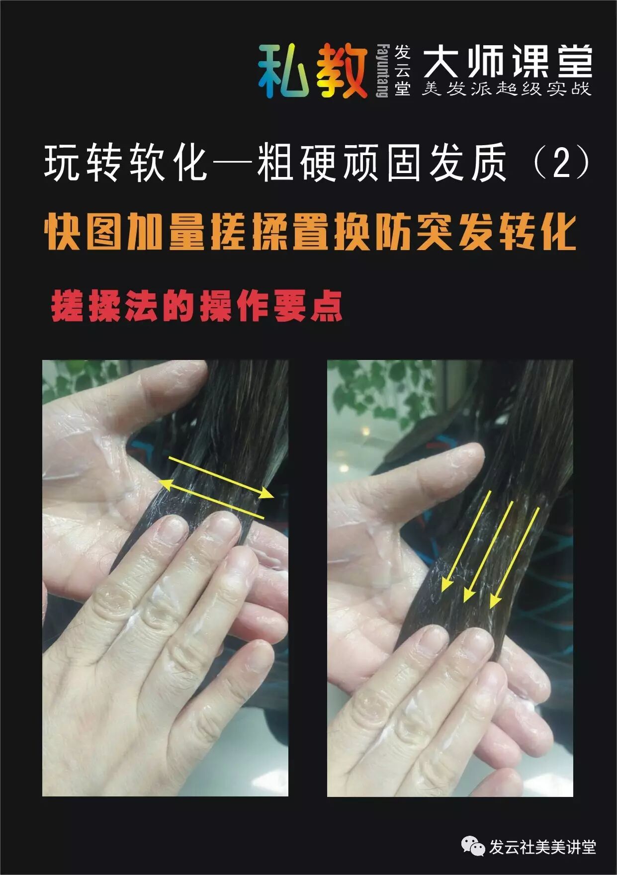 图中有五项技术:穿透、膨胀、祛酸、还原、终止,全部都是针对顽固发质的招式,我一个一个给大家讲解。先说穿透,从字面意思可以理解为穿透坚硬顽固的毛鳞片,大家都知道,顽固头发表皮层非常坚硬,用正常手段很难让其在15分钟内达到软化标准,那么我们首先就是要解决穿透的速度,也就是毛鳞片打开的速度,才能让药水快速渗透到头发里去。所以穿透必须用我们前面讲到过的搓揉法+置换法来提升速度。先讲一下搓揉法,看图: