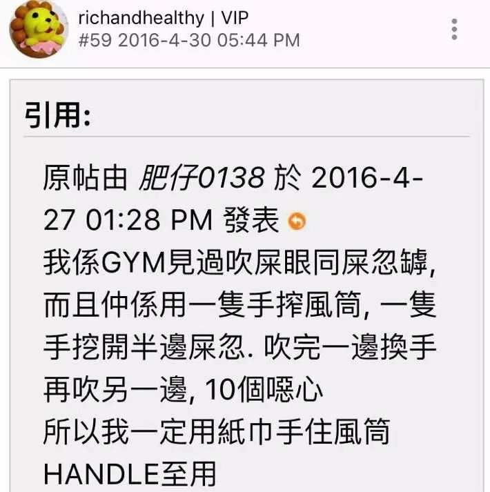 网民指,当时他运动完准备洗澡,该中年男子却用风筒吹:「又是吹屁股又是吹私处最后还吹脚趾,可不可以有点公德心。」影片被转贴到爆料公社后,引起其他网民热议:「在烤鸡吗?」更纷纷批评此举十分没有公德心。
