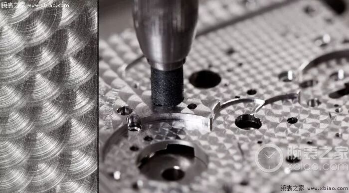 鱼鳞纹是另一种传统润饰工艺,也被称为旋转式打圈纹或点刻,指利用旋转木钉,在底板或桥板表面装饰重叠的小圆圈图案。此类纹饰常见于隐藏表面,如底板背面(表盘下方)或凹处。这是少数无法实现全自动的工艺之一,通常需要手工作业。