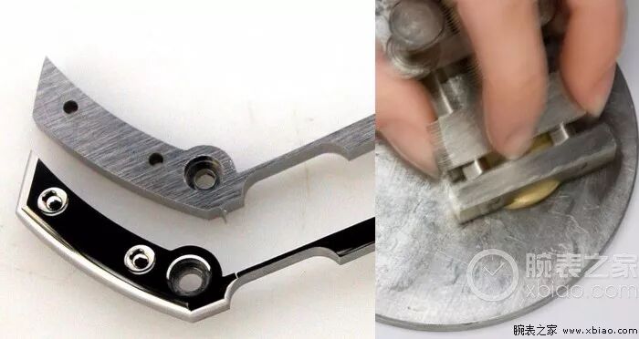 黑色抛光前后的机芯零件(左);轻柔研磨机芯零件,实现镜面抛光(右)。