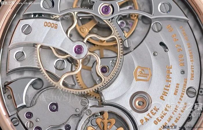百达翡丽5016R陀飞轮三问万年历腕表,齿轮上的弧形辐条完全由手工倒角润饰。