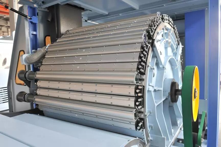 4、新型回转盖板传动及其清洁系统:回转盖板和刷辊均采用单独变频电机传动,方便根据工艺需要分别调整回转盖板和刷辊速度,确保分梳质量及盖板清洁。