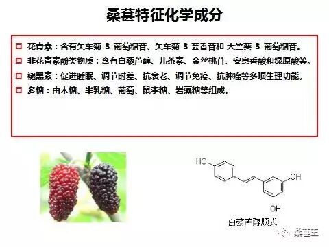 特别是桑果中含有一种叫(白黎芦醇)(RES)的物质,能刺激人体内某些基因,抑制癌细胞生长,阻止血液细胞中栓塞的形成。另外,它可以促进血红细胞的生长,防止白细胞减少。