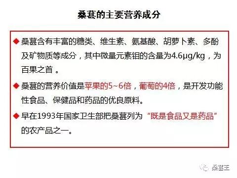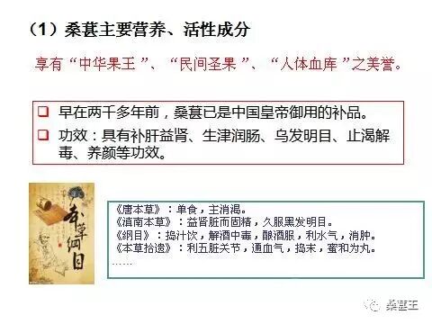 据《本草纲目》记载:桑葚具有补肝益肾、滋阴养血、健脾乌发之功能,主治阴虚、头晕目眩、失眠健忘等多种病症。现代医学研究证明桑果具有增强免疫、促进造血细胞生长,抗诱变,抗衰老,降血糖,降血脂,护肝润肺,美肤护颜功能。。