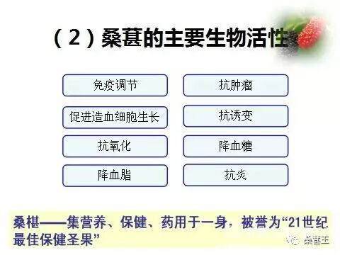 桑葚具有许多活性物质,促进造血细胞生长、降糖、降脂、降血压、护肝、抗 AIDS作用,在临床上应用很广,尤其是对中老年病和延缓袞老有重要意义。