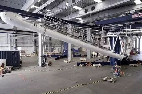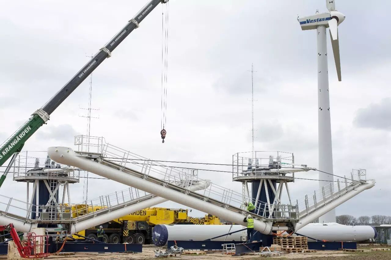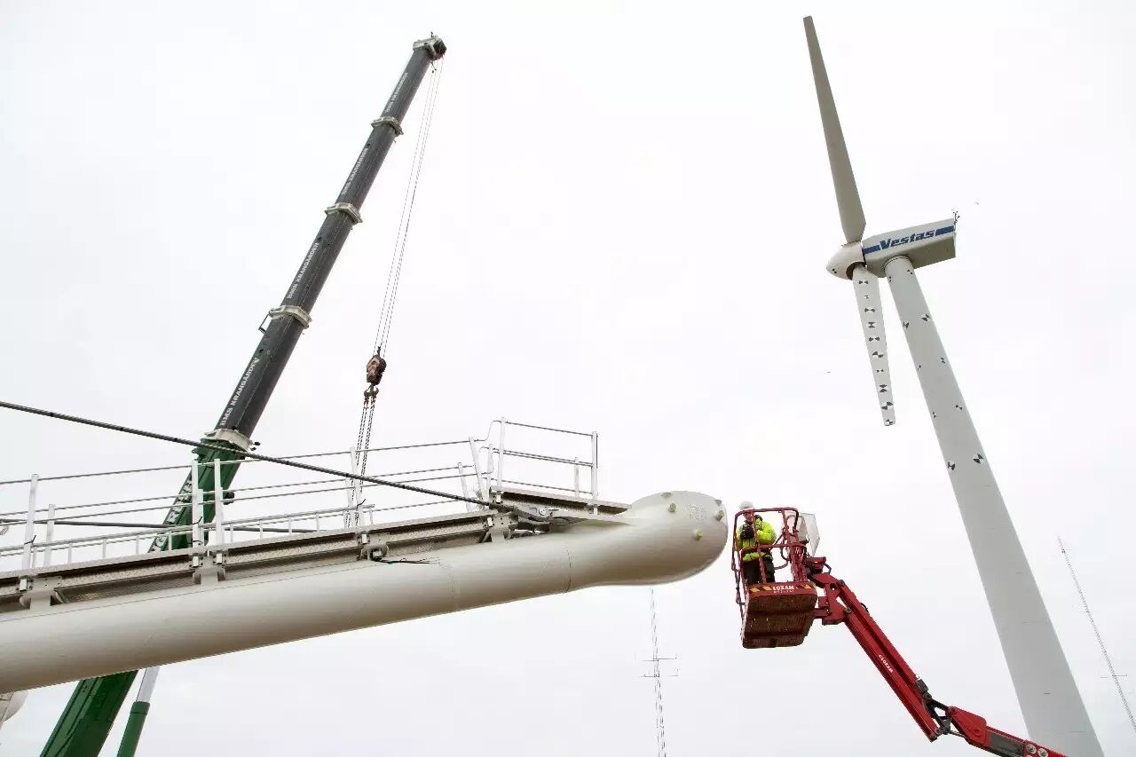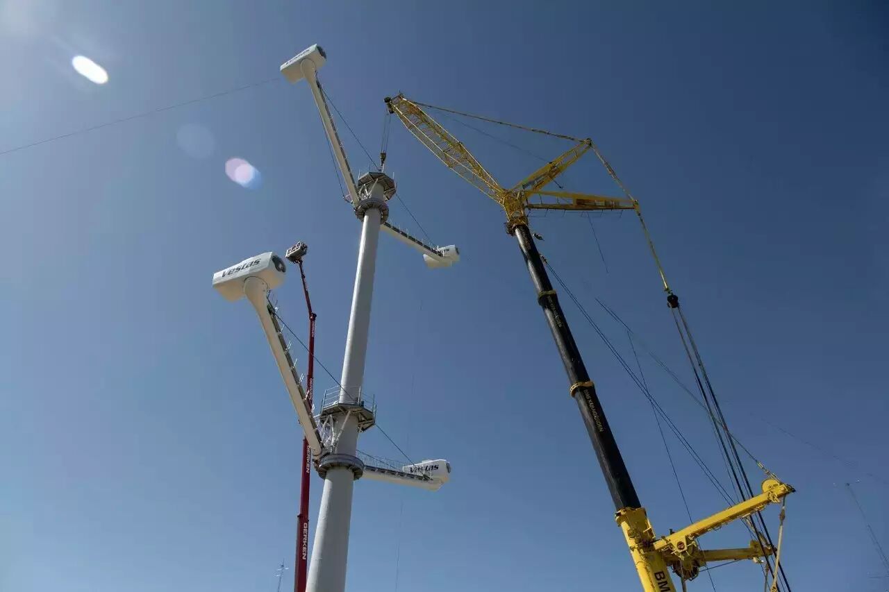 而且它的吊装建设看起来也并不复杂。图上看到的最大吨位吊车应为500吨左右的吊车,这和常规1.5MW-2MW使用的吊车级别基本一致,不过缩小的风叶与各组件明显能降低运输的难度。