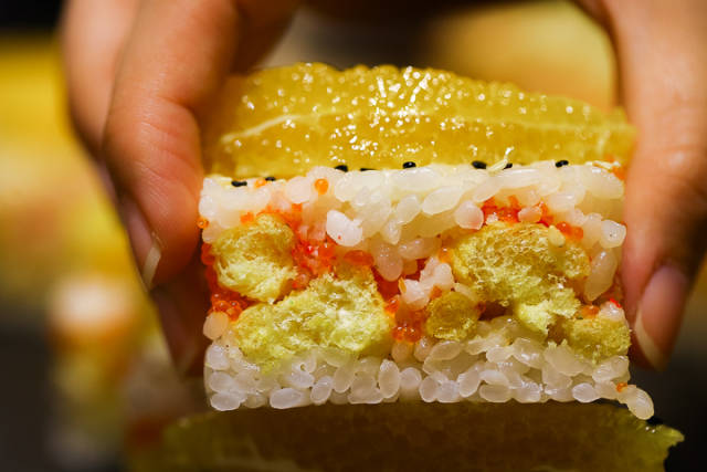 鲜果蟹肉香脆千层,一入口首先感受到果肉的鲜甜多汁,然后是蟹肉同蟹子的鲜,再然后是脆卜卜的口感,原来加入咗天妇罗,难怪店里全部寿司都是采用即点即做,保证咗最佳的口感!记得一上台就趁早食啦!
