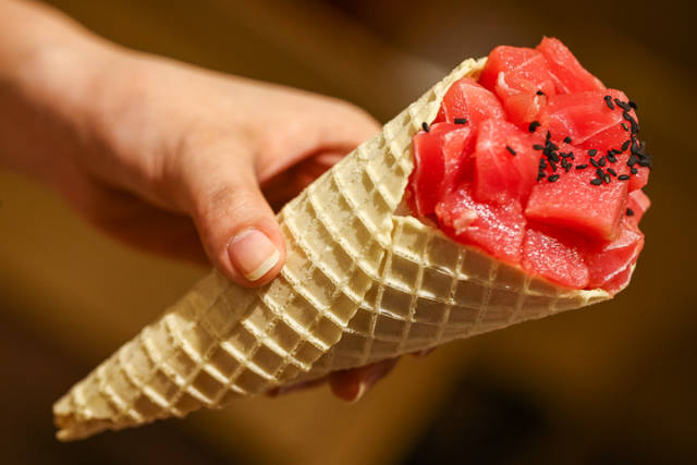 一个雪糕拿上手,颇具份量,吞拿鱼寿司雪糕,红嫩透光的吞拿鱼肉,名符其实( ﹁ ﹁ ) ~→色诱!