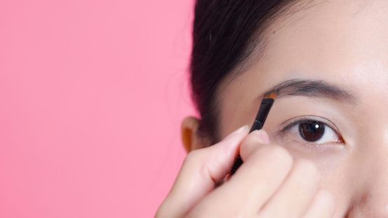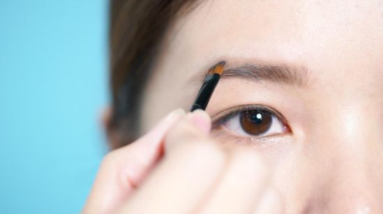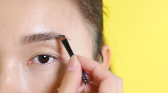 第二步:画眉,自然落尾眉:蘸取深棕色眉粉,沿着眉毛生长方向自然填充,眉尾细而尖,稍往下(但不能低于眉头哦),打造自然落尾眉。