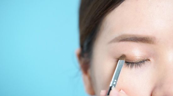 第三步:用大地色眼影打造小烟熏眼妆,更有酷酷的感觉。画法:先用最浅色打底,然后用浅黄棕色涂抹在双眼皮褶皱处,接着用棕褐色沿睫毛根部描画,并晕染眼尾以及下眼睑1/3处。