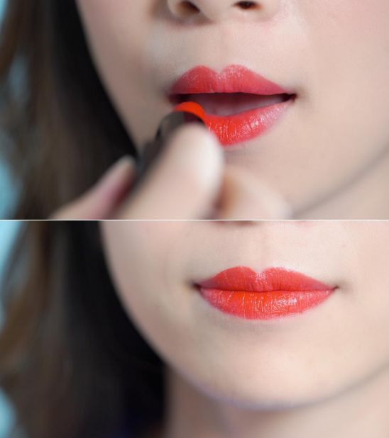 那么最后一步就是画唇妆了。用烈焰红唇膏打造 咬唇妆,,接着用指腹晕染开就OK了