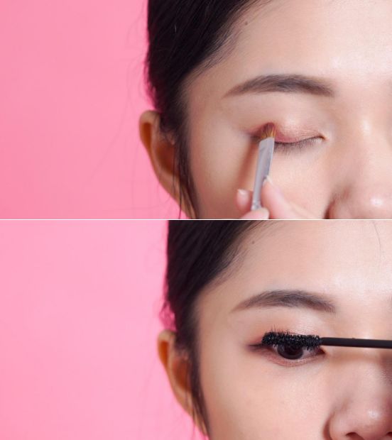 那么眉毛画好了,接下来如果你想要放大双眼,可以用偏粉色的眼影画点眼妆,会显得更加粉嫩可爱一点,然后画一条细细的眼线,刷上睫毛膏,圆圆的眼睛就出现咯。