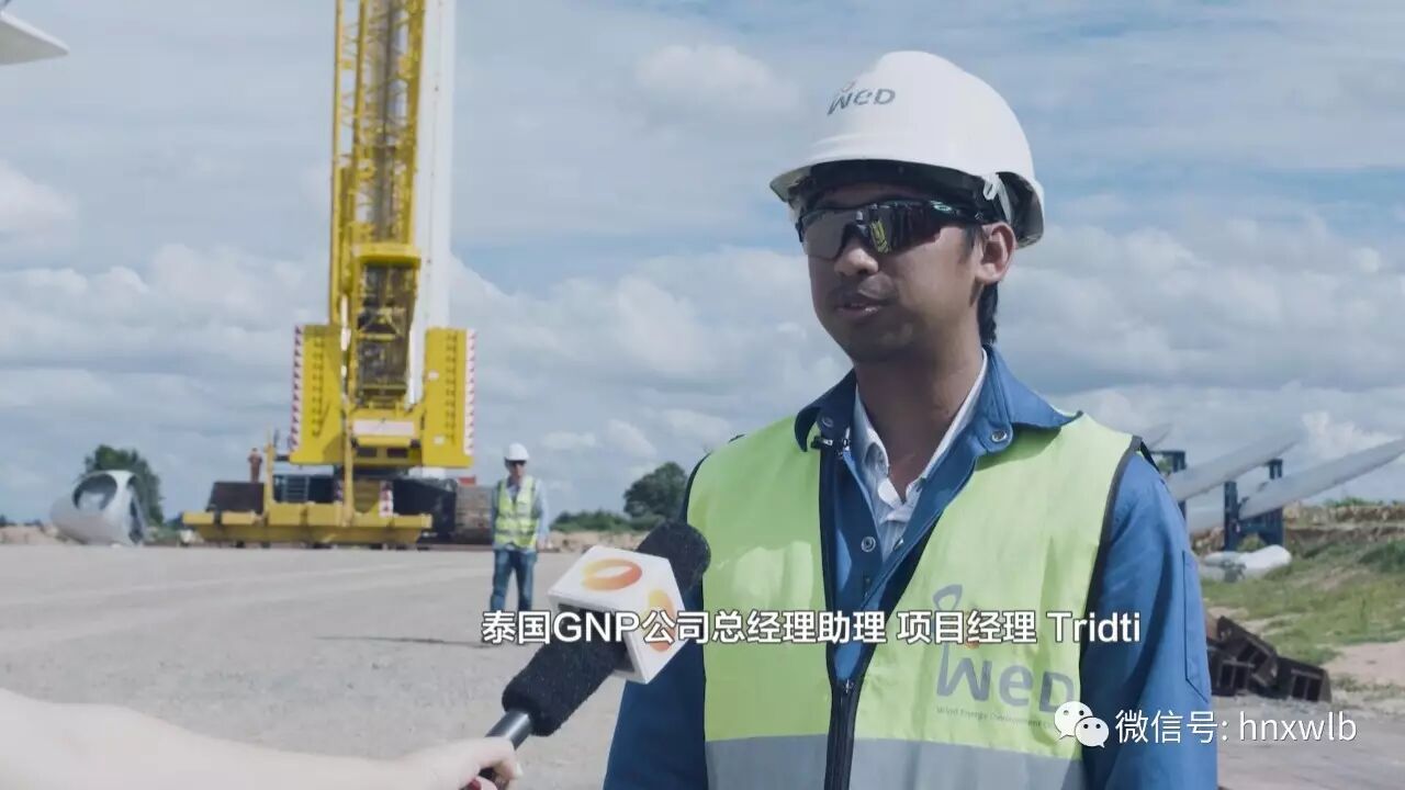 中国电建集团中南勘测设计研究院泰国GNP风电总承包项目经理 彭欢:风机塔筒高度是153米,叶尖高度为210米,相当于70层楼的高度。