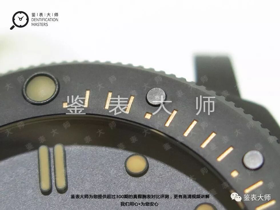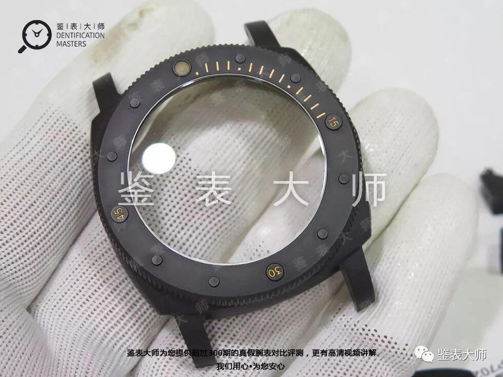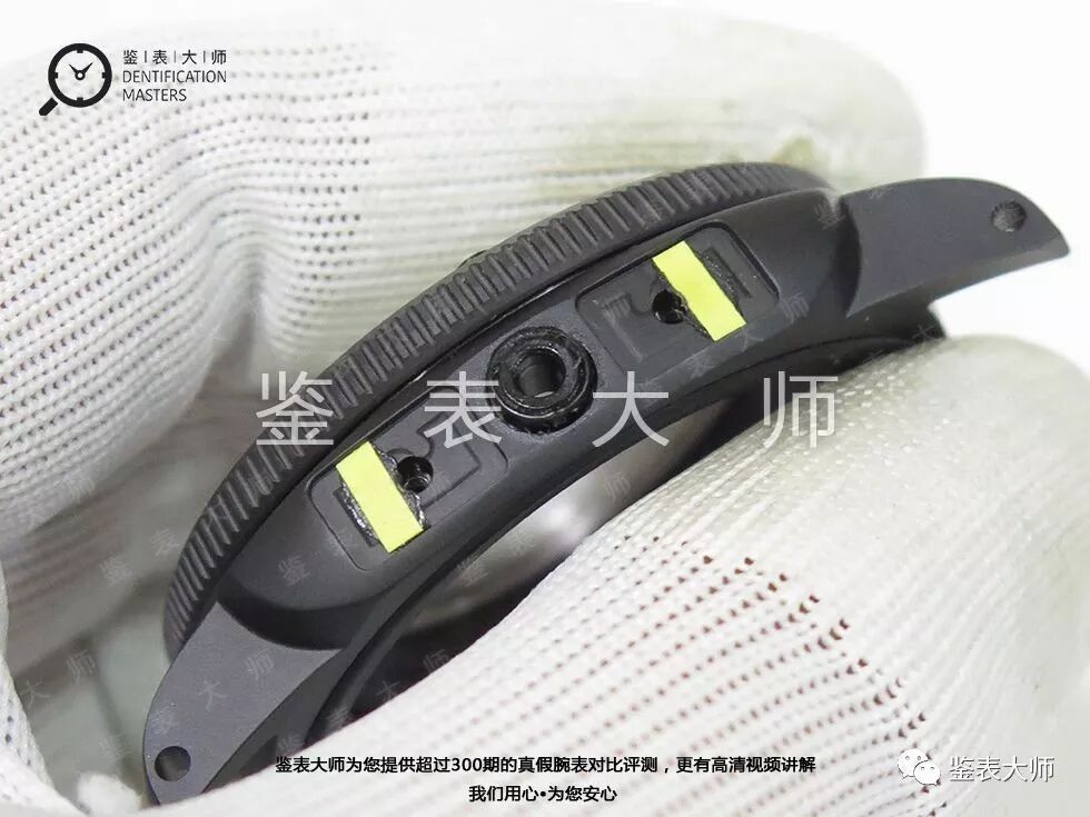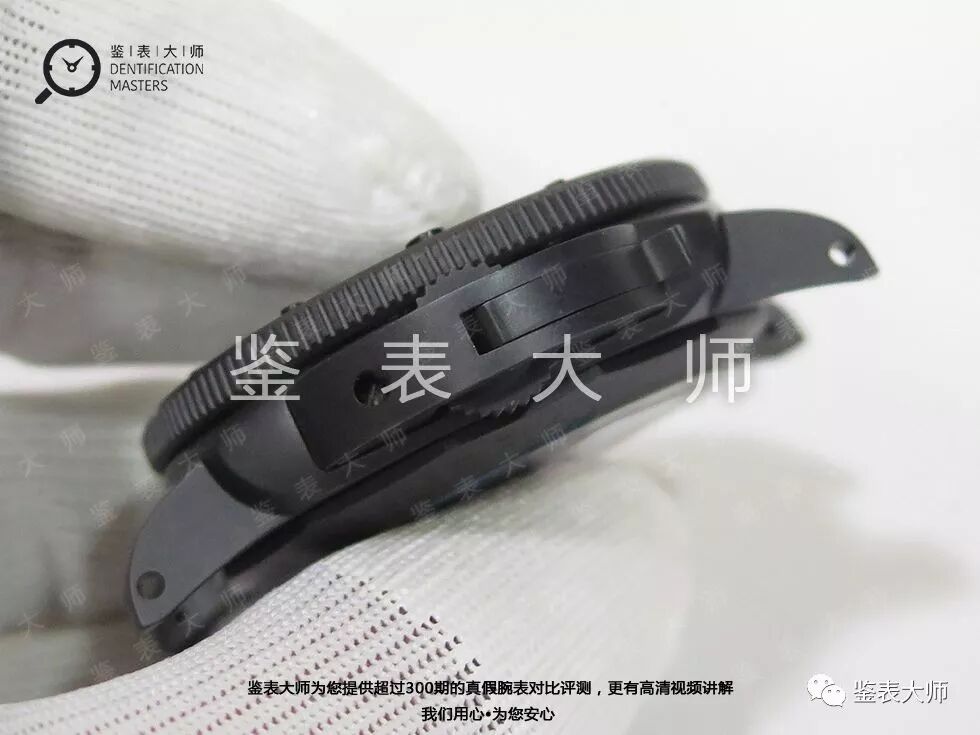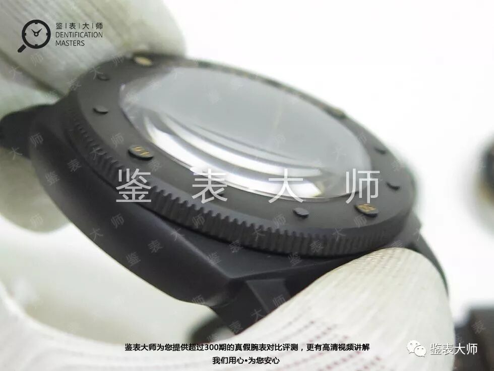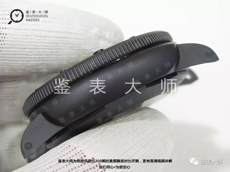 腕表采用哑光陶瓷表壳,色调如漆黑深邃,硬汉专用款式无疑。从表壳均匀的颜色和平滑的哑光外光,可以看出VS厂高端的制作工艺。腕表表圈采用与表壳相同的哑光陶瓷材质制成,单向旋转表圈,在潜水时可以确定下潜的时间长度。