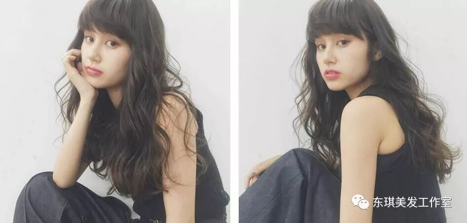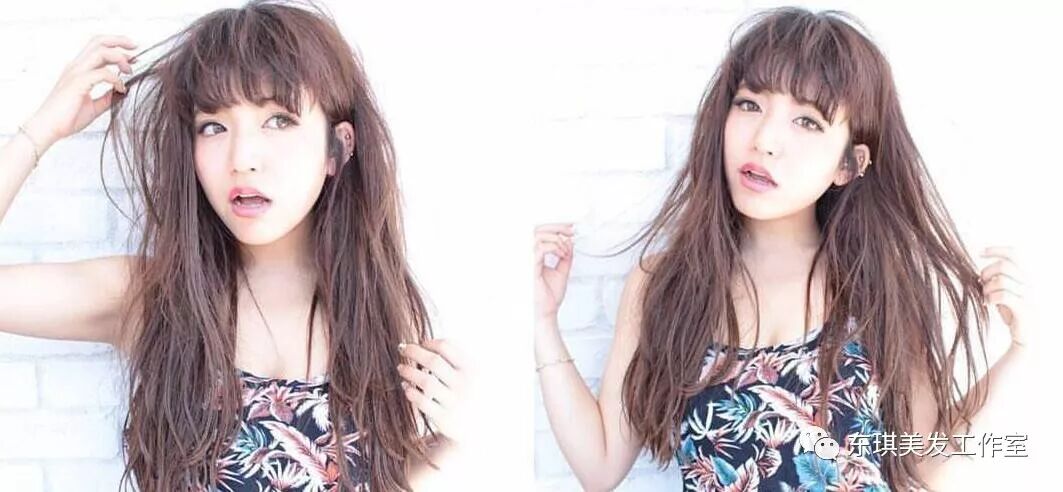 妹子的一头发丝经过空气烫发处理后充满曲线感,显得发量丰盈,加上偏分的造型设计,使两边发量不对称,一侧头发贴服与眼睑前卷曲而蓬松,轻松便修饰了脸蛋的缺点,更突出妹子小巧的下巴。