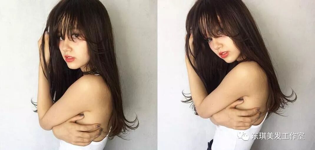 把一头披肩的长发随意披散在肩膀前,发丝经过空气烫发效果变得很有纹理感,抓松的凌乱感衬托出妹子身上的慵懒气质,修剪出弧度状的齐刘海轻轻贴在额前,不经意便突出妹子精致的五官。