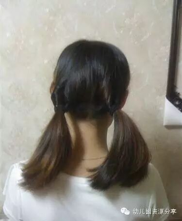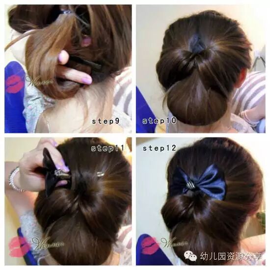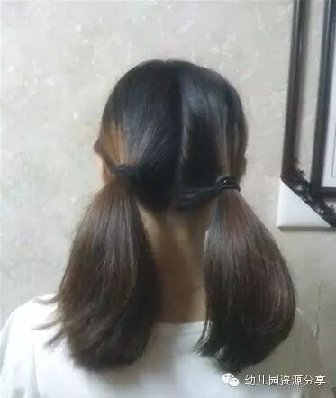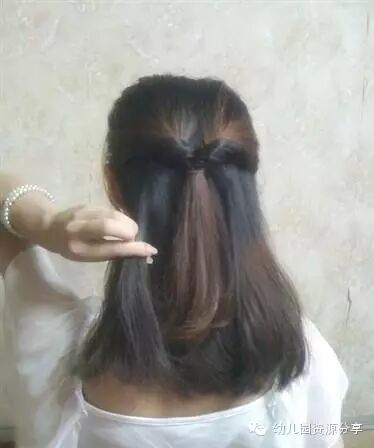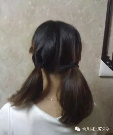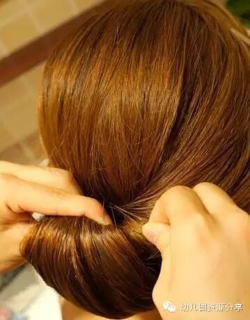 那整个发尾部分用皮筋固定好,如图所示,然后把头发向两侧拉成一个花苞形,用卡子固定好就完成了,很简单实用的一款。