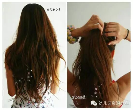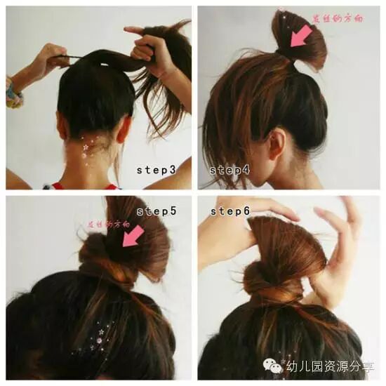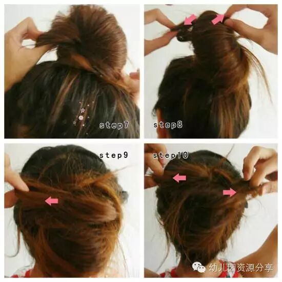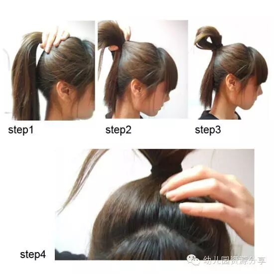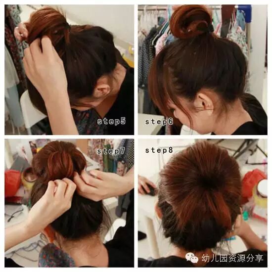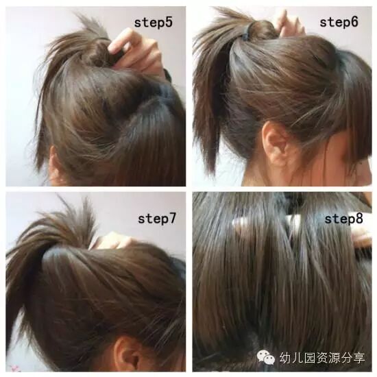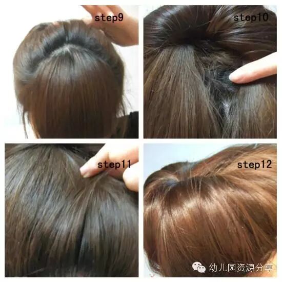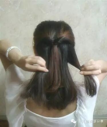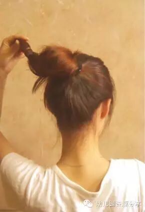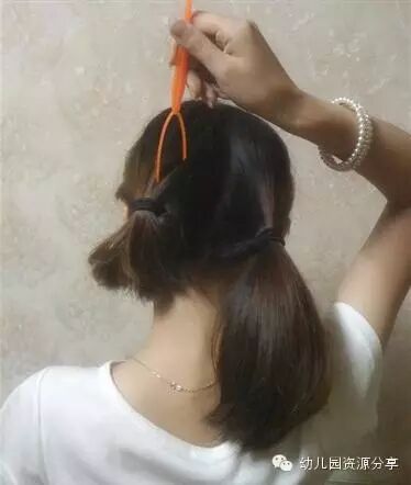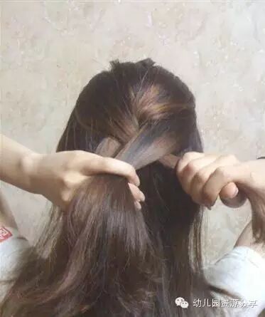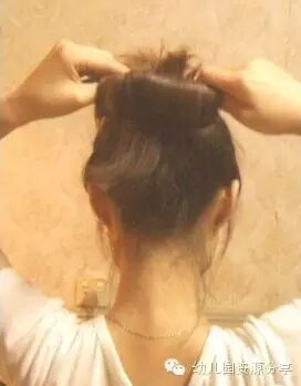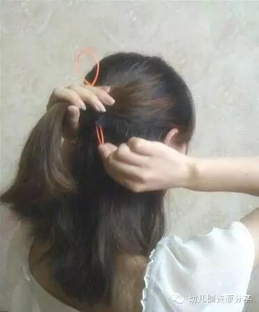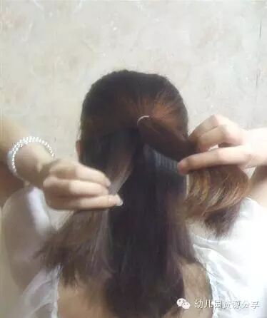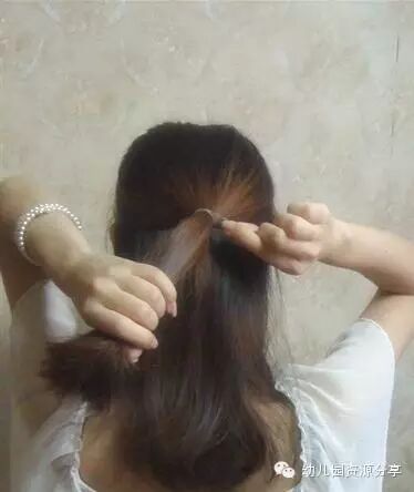 把头发高高的梳起一个马尾,并握起一个拳头大的发箍,用皮筋固定,然后把马尾上的头顶中间部分的头发挖一个小洞。