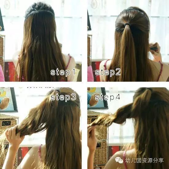 平行于耳朵线以上的一些头发,用尖尾梳分一条线。用皮筋将分好的上半部分头发扎起来 。用梳子将扎好的头发发毛分成两股。将两股头发像编两股辫一样缠绕