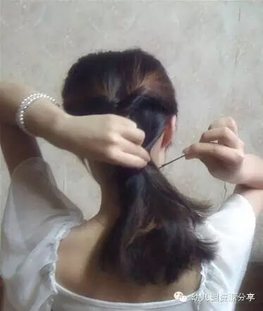 抓起发梢往内卷起,用的是平头的鸭嘴夹牢固点,翻下去直接夹起来,左右各一个就可以固定了,再用个小小的发饰遮住皮筋就完成了!