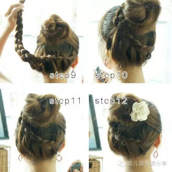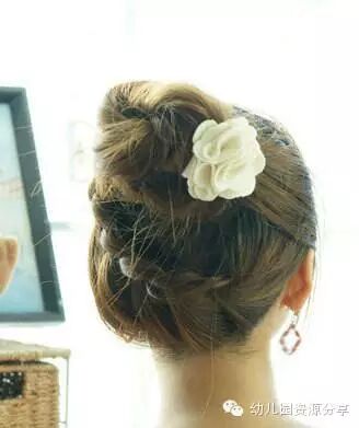 编完用皮筋收尾。蜈蚣辫的发尾绕在花苞的根部,用卡子固定。在卡上一漂亮的发花就完成了。