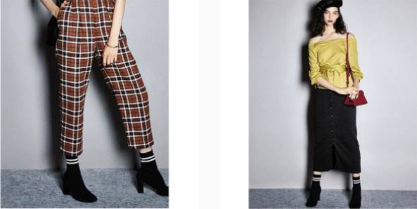 在设计上也会结合当前的一些流行趋势,比如今年特别流行的校服裤,长筒靴等等。
