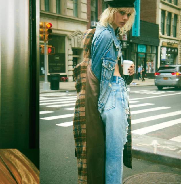 上面这两张图就很好的展现了Moussy的风格,厚重的牛仔外套和牛仔裤,内搭一件运动内衣,外套一件格纹大衣,对,就是十分个性、劲酷十足的品牌。
