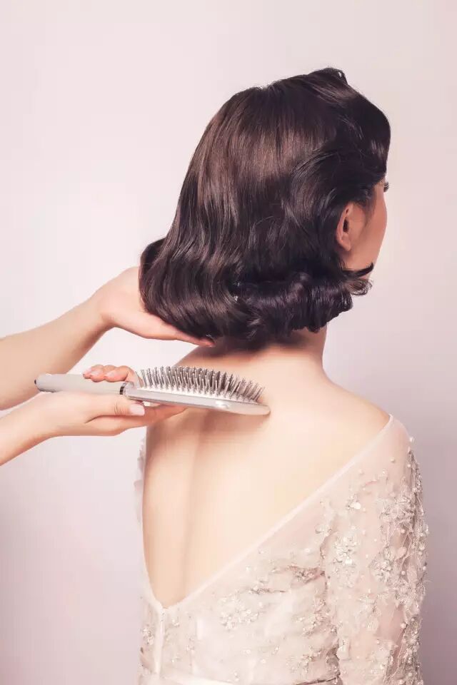 步骤四:将推好的波纹用鸭嘴夹固定,并用气垫梳将发尾梳理通顺后,往上做内卷处理,并喷以适量发胶后用鸭嘴卡固定。