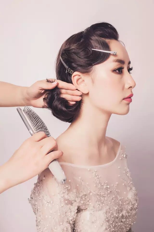 造型重点:烫发时注意卷度合适,保持头发蓬松自然;手推波纹处理时确保发片光滑干净,且波纹弧度和大小要合适,固定时注意与后区头发自然衔接,同时隐藏发尾与发卡;翻卷处理时注意发卷的大小要合适,固定时注意发卷与发卷之间要衔接自然。