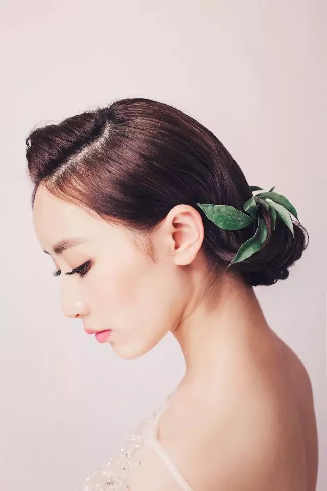 步骤九:在发型的左侧佩戴上绿叶饰品进行点缀与修饰,完成造型。