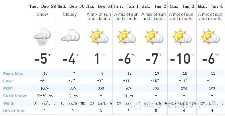 根据气象预报显示,本周的气温也非常严寒。除了周三温度稍暖外,这周的天气几乎都会在零下10度左右。周六(1月2日)和周六(1月3日)的气温更会低至零下16度。