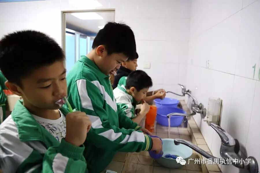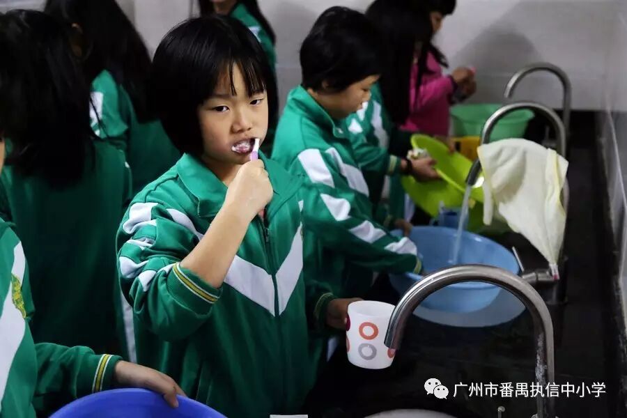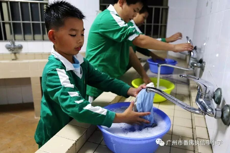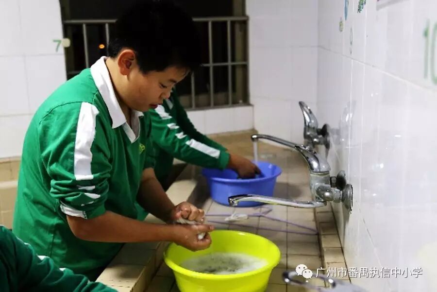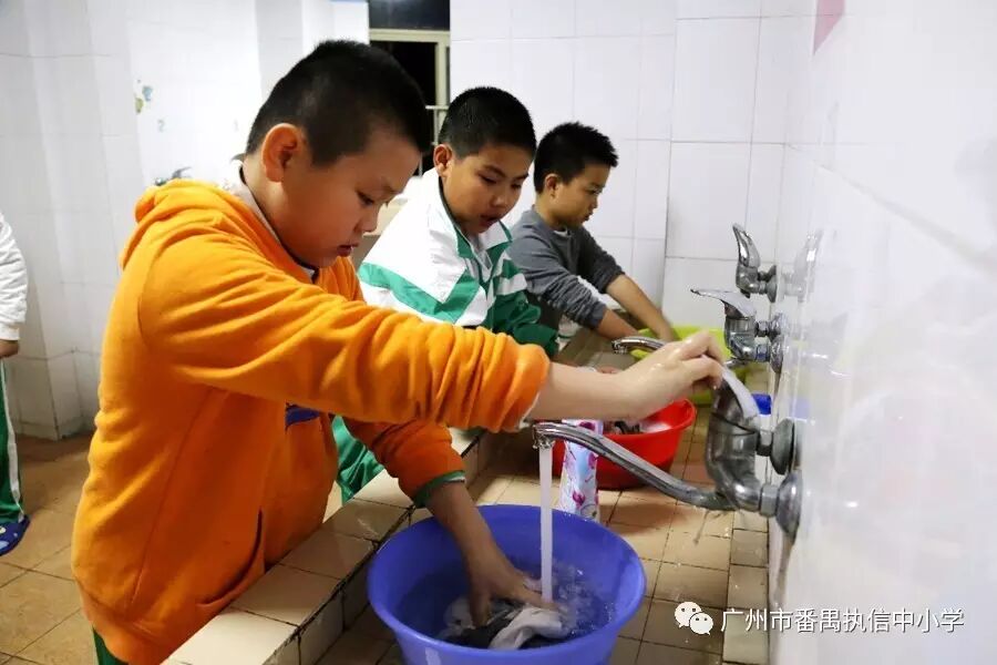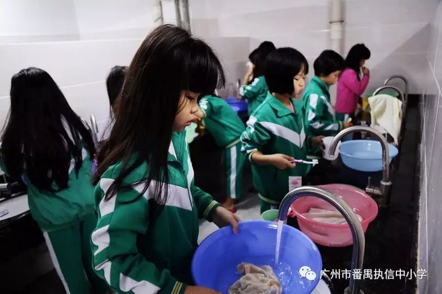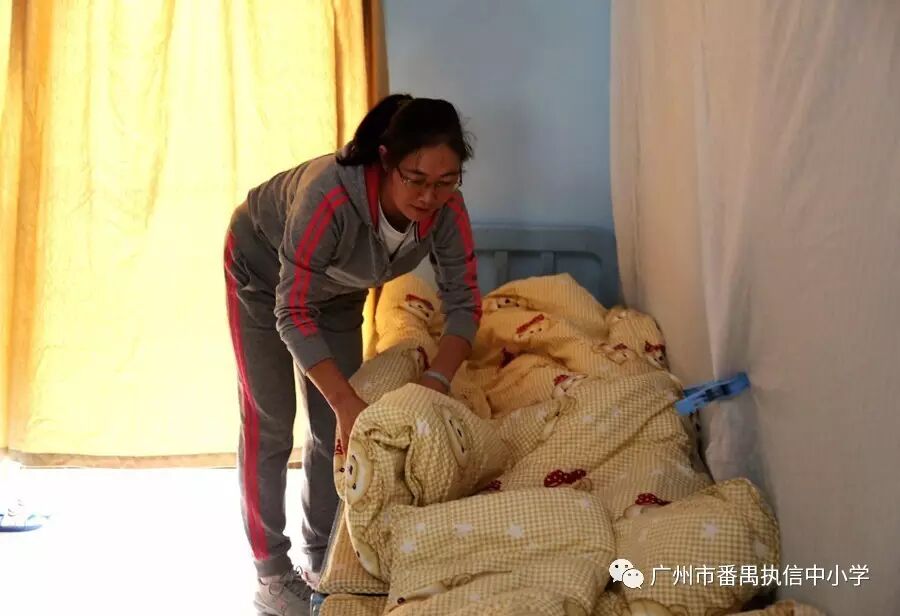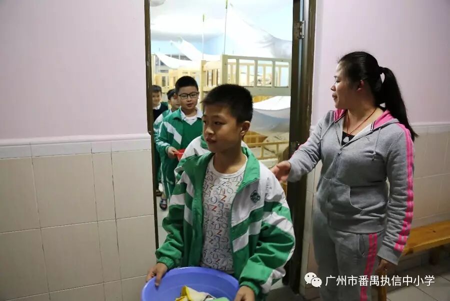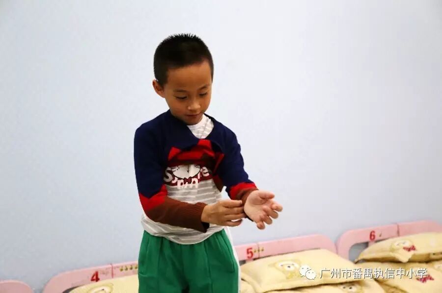她们将学生寝室灯逐一开启并唤醒每位孩子,督促孩子们起床、洗漱,根据天气变化情况提醒孩子们添减衣物并指导孩子们整理好内务。这些工作要在起床后半小时内做好。