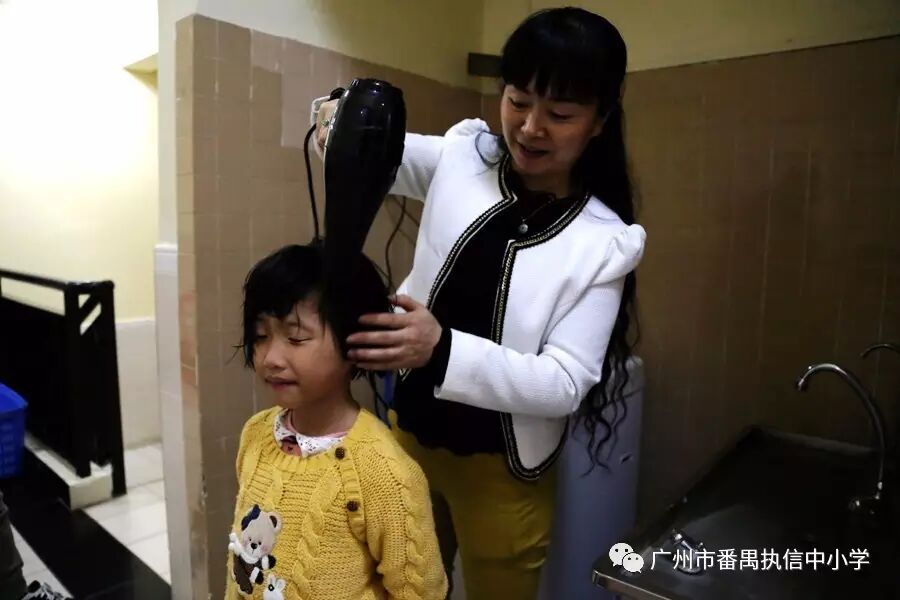 又是一个忙碌的时刻,辅导老师照看孩子们洗澡。孩子们的尖叫声、辅导老师的提醒声还有沙沙的水流声在宿舍汇聚成欢乐的曲子。每次洗完澡叮嘱小朋友们穿好衣服后,星执“妈妈”开始打理班上小女生的长发,擦干水滴,拿风筒仔细吹干,一环接一环,直到把每个孩子都打扮得美美的。