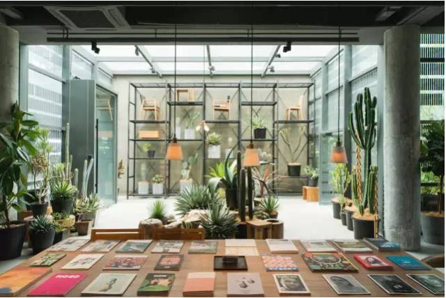 那张富有工业感的大长桌上,摆满了绿植和琳琅满目的英文读物。既能让所有的朋友聚在同一张桌子上分享咖啡时光,也可以独自享受与国际多元文化碰撞的一隅空间。