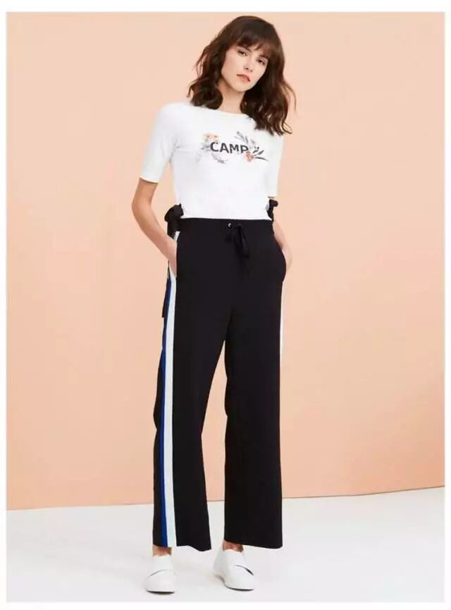 将运动风加在阔腿裤上的设计里是比较潮流的