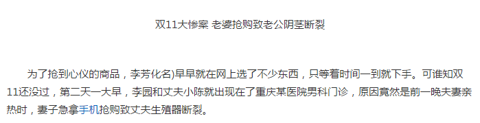 为了抢到心仪的商品,李芳(化名)早早就在网上选了不少东西,只等着时间一到就下手。可谁知双11还没过,第二天一大早,李园和丈夫小陈就出现在了重庆某医院男科门诊,原因竟然是前一晚夫妻亲热时,妻子急拿手机抢购致丈夫生殖器断裂。