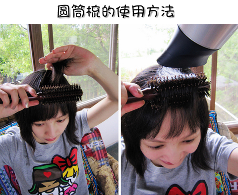 头发分束,一小发束梳顺,头发发尾往内卷,梳子要往下拉紧,吹风机由上往下吹整定型。
