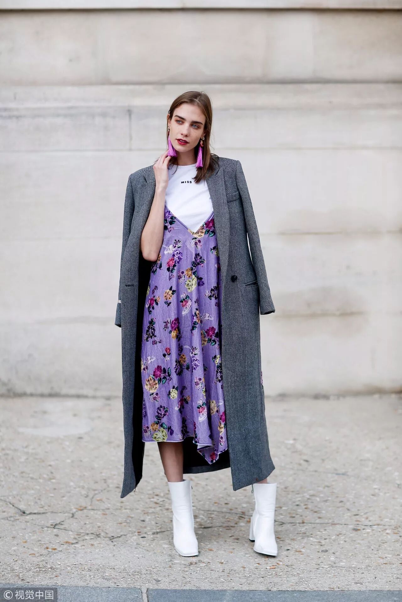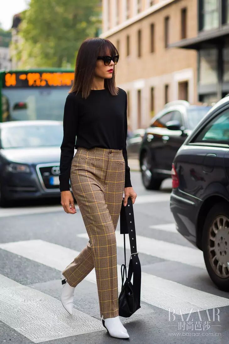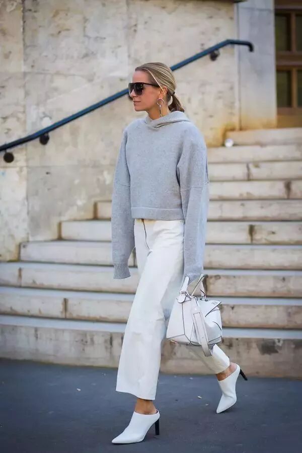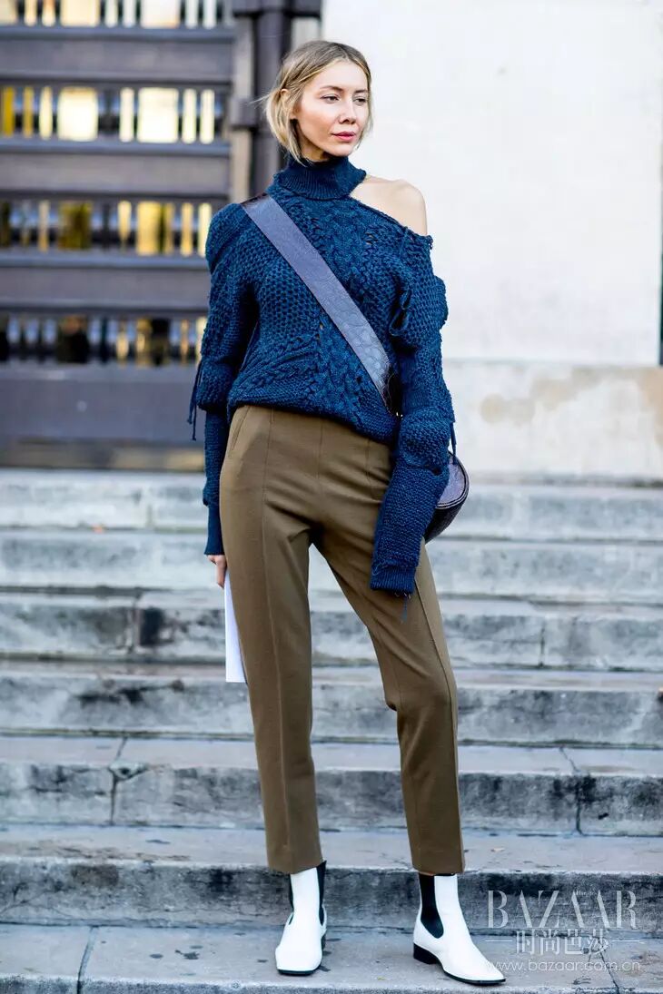 及踝小白靴搭配阔腿裤则有复古的味道,纯色的穿搭突出了极简主义的纯粹。