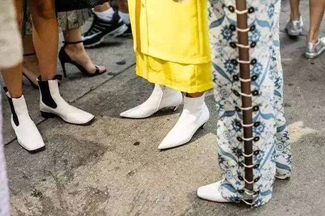 今年火爆流行的猫跟,在小白靴中的运用依然很多,在高度与粗细上更加的多元化了,高低粗细变化多样。