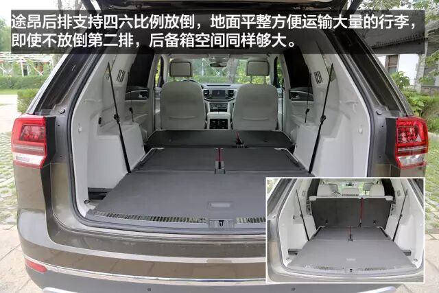 在后备箱方面,途昂的后排支持四六比例放倒,地面平整方便运输大量的行李,即使不放倒第二排,后备箱空间同样够大,旅行途中你想带多少东西都可以,即使外出野餐也不会发愁炊具没有地方放。